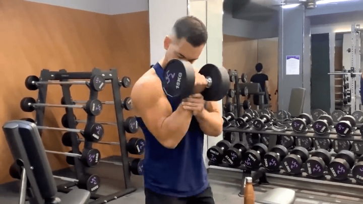 查看详情拥有健硕的三角肌看起来就会威风凛凛,尽显男子气概,当然穿衣服也会显得挺拔,肩部工整。三角肌,实际上就是虎头肌,属于肩部肌群,包含了前束、中束和后束三束肌肉。既然三角肌包含三个部分,可以根据孤立原则,我们应该尽可以的孤立每一个部分进行锻炼。坐姿哑铃推举是一个主要发展三角肌中束的动作,可以让肩部变宽,还有助于提高两边肩部平衡感和稳定性。这个动作除了主要训练三角肌中束外,还可以锻炼到肱三头肌、斜方肌和前锯肌等。训练步骤:1.将平凳调到最高的位置,坐在平登上后,双脚自然打开,双腿稳定住身体,臀部尽量向靠背上贴紧,腰部收紧不要贴住靠背,收腹挺胸,双手握住哑铃中间的位置,从身体两侧举起,保持在大臂和小臂的夹角为90度,手心朝向正前方;2.深吸气